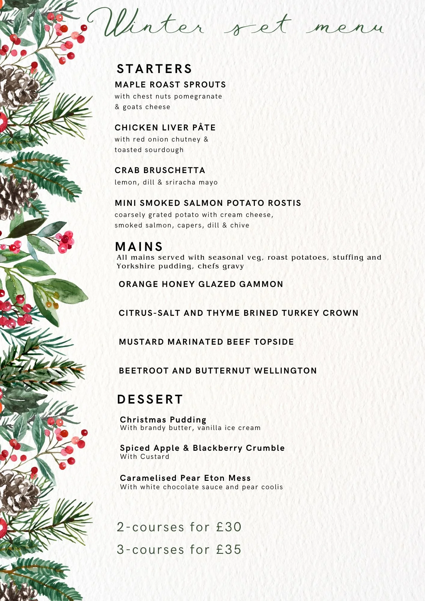 Winter Set MenuAvailable for parties of 6 people + Our Menu’sPlease come in and see our beautifully Crafted Specials Board… Drinks